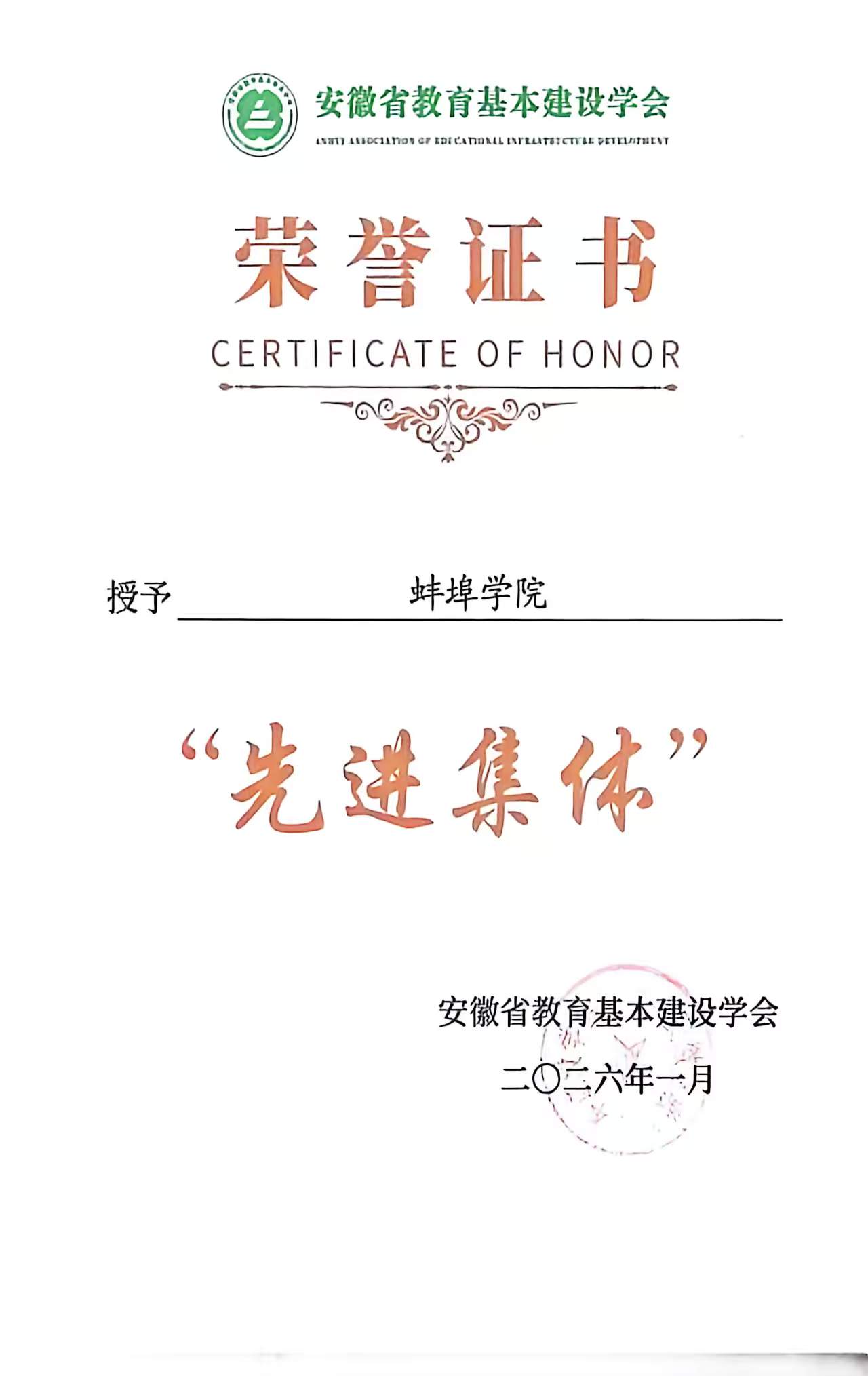 2026年1月16日,安徽省教育基本建设学会第七次会员代表大会在合肥召开,学校基建处一行赴合肥参加会议。学校获评安徽省教育基本建设学会“先进集体”,为学校争得了荣誉。